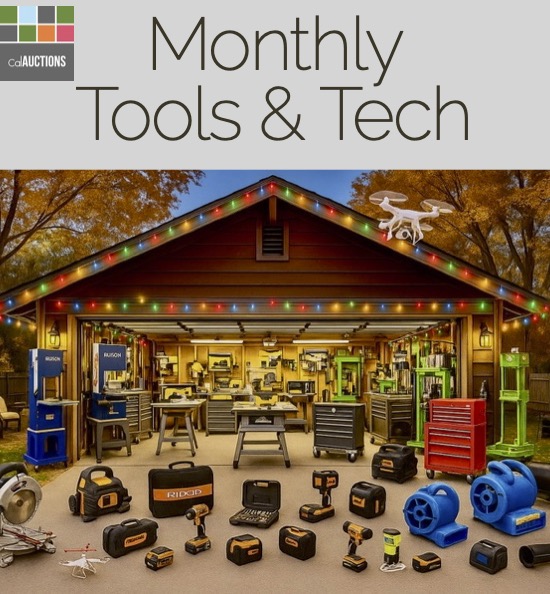 This month’s Tools & Tech Auction features professional tools, shop equipment, and advanced tech, led by a Formlabs Form 3BL 3D printer, additional Formlabs resin tanks, resin cartridges, wash and cure units, and an Anycubic Photon 3D printer. Other key items include band saws, planers, table saws, drill presses, hydraulic presses, air compressors, sanders, grinders, routers, nailers, and socket and ratchet sets. The sale also includes cameras, tripods, GoPros, drones, power stations, smart locks, audio gear, and assorted shop storage including tool chests, roller cabinets, workbenches, metal shelving, organizers, and dollies. Additional items span clamps, vises, fasteners, heating and cooling equipment, plumbing and irrigation supplies, lawn and garden tools, welding equipment, woodworking tools, safety and testing tools, automotive tools, towing gear, outdoor and camping items, hand tools, blades, abrasives, lighting and electrical equipment, measuring tools, apparel, general hardware, and a small selection of framed artwork and décor.