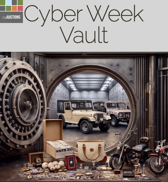 This Cyber Week auction features a diverse selection of vehicles, collectibles, jewelry, and luxury goods. Featured highlights include a 1963 Willys Jeep and an Electric Club Car utility vehicle designed to resemble a mini Hummer, with proceeds from both benefiting Father Joe’s Villages, along with a 1971 Harley-Davidson FLH Shovelhead motorcycle and a 1970 Honda Trail 90 motorcycle. The auction includes a variety of jewelry such as gold, silver, diamonds, pearls, rubies, emeralds, opal, turquoise, jade, and other semi-precious stones. Designer bags and wallets include pieces by Louis Vuitton, Gucci, Coach, and Kate Spade. Sterling silver offerings include flatware, candlesticks, trinkets, and additional silver items. Sports memorabilia is also featured, including a Louisville Slugger baseball bat, autographed baseballs, and trading cards across baseball, football, basketball, soccer, and hockey. Currency and coin lots include two-dollar bills, silver certificates, Eisenhower dollar coins, proof and mint sets, silver coins, buffalo nickels, and wheat cents.