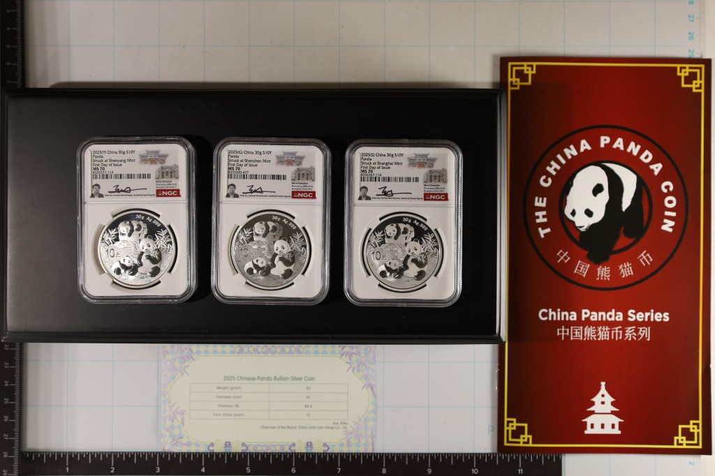 PANDA 3 COIN SIGNATURE SERIES Y-S-G MINT SET IN MS70, 10.79 OZ. STERLING CALANDER ART MEDAL, INDIA BELE GOLD COIN, HOTWHEELS SILVER "NIGHT SHIFTER" CAR COIN, MS70 KRUGERRAND SILVER RAND, HOBO NICKELS, CALAMATIY JANE AND BUFFALO BILL TOKENS, GRADED MORGAN AND PEACE DOLLARS, P/D/S SET OF BUFFALO NICKELS, TRADERBEA SILVER ROUND, DEATH OF FLYING ACE, MINI SILVER ROUNDS AND INGOTS, HORSEBLANKET US SILVER CERTIFICATE, EARLY RELEASES MS70 AMERICAN SILVER EAGLE, WEDGE-TAILED 1 OUNCE SILVER, US FRACTIONAL CURRENCY, WTC RECOVERED GRADED COIN, STERLING SILVER 1.85 OZ. INGOT, TRANSPORTATION TOKENS, 1700'S TOKENS, DAMASCUS KNIVES, SILVER ANCIENT COINS, PRESIDENTIAL THEMED POSTAGE BLOCKS, METORITE PIECE, CUBAN CURRENCY, RAILROAD STOCK CERTS, HALL OF FAME SILVER ASTRONAUT HALL OF FAME MEDAL, GAMING CHIPS AND SILVER TOKENS, PROOF AND MINT SETS, PINUP AND ADULT CARDS WITH SILVER VALCAMBI BARS, POLYMER BILLS, WALKING LIBERTY AND BARBER HALVES, COPPER ROUNDS, NATIONAL CURRENCY AND MANY OTHER ITEMS! WWW.BIDALOTCOINAUCTION.COM, BIDALOTAUCTION@AOL.COM, 1-386-675-6768. THANKS FOR LOOKING!