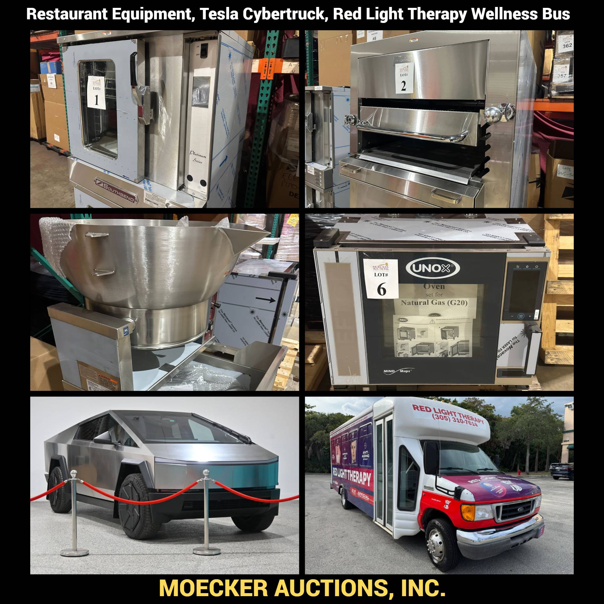 Featuring an excellent selection of brand-new commercial restaurant equipment, including Southbend gas convection ovens, restaurant ranges, griddles, and an upright infrared broiler, along with UNOX Cheftop combi ovens, racks, baking sheets, and stands, Crown electric cooking equipment, Everpure water filtration systems, and assorted UNOX chemicals, accessories, and replacement parts, 2024 Tesla Cybertruck Foundation Series and 2007 Ford Red Light Therapy Wellness Bus fully equipped with light therapy equipment.