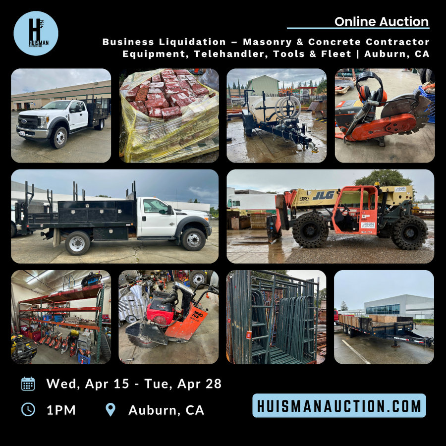 This online auction in Auburn, California features a complete business liquidation of a working masonry and concrete contractor, offering a wide range of equipment, tools, fleet vehicles, scaffolding, and jobsite assets ready to go back to work.